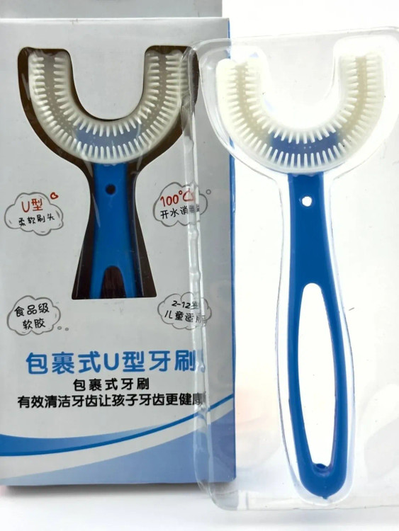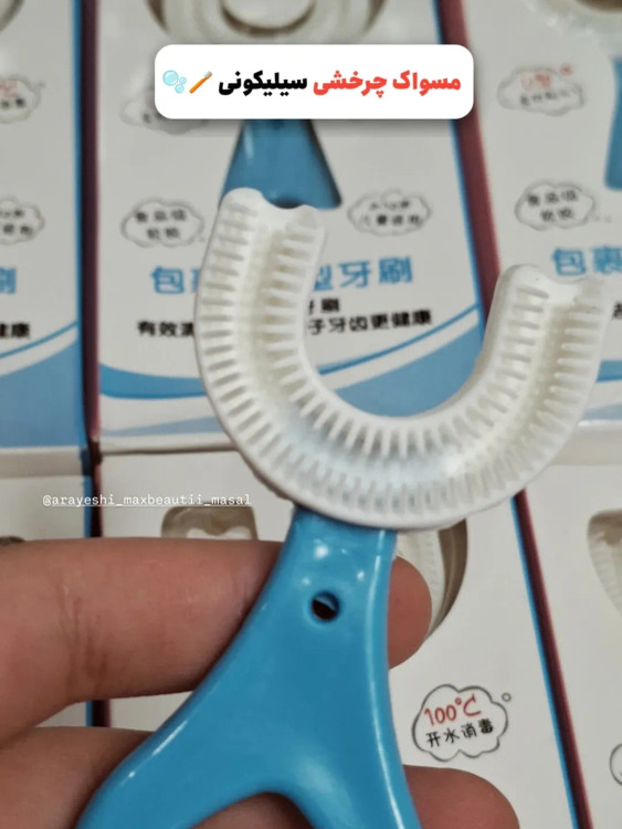 مسواک چرخشی سری یو شکل و سیلیکونی با فرچه دوطرفه مخصوص تميز كردن جلو و پشت دندان، ابعاد مناسب دستان كودک و قابل استفاده با انواع خمير دندان مناسب سن ۶ سال فاقد مواد مضر و سمی.