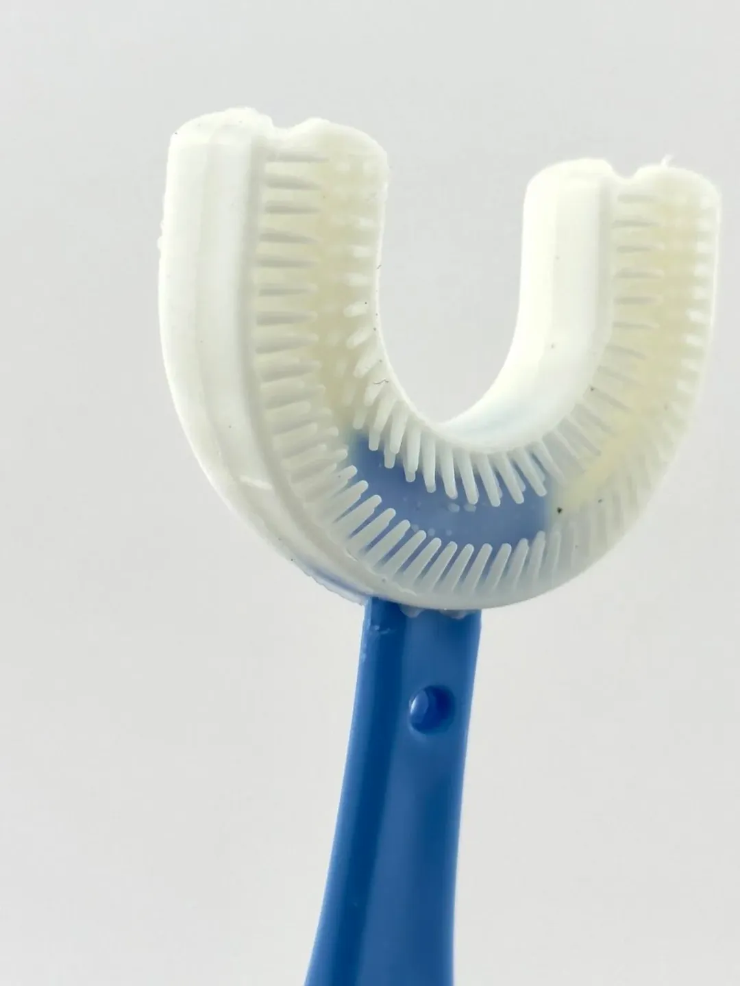 مسواک چرخشی سری یو شکل و سیلیکونی با فرچه دوطرفه مخصوص تميز كردن جلو و پشت دندان، ابعاد مناسب دستان كودک و قابل استفاده با انواع خمير دندان مناسب سن ۶ سال فاقد مواد مضر و سمی.